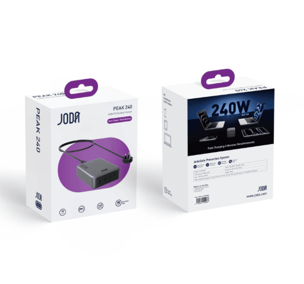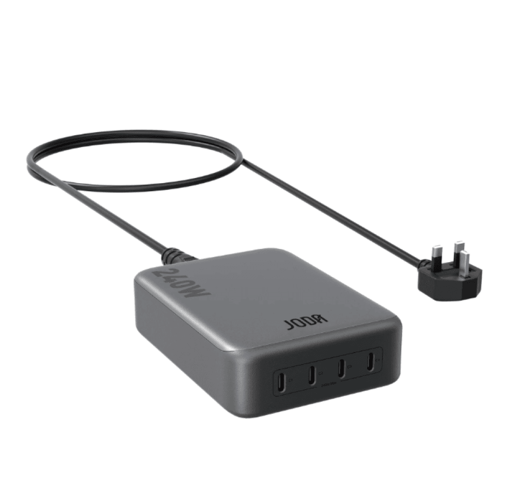 منصة شحن جودا توفر تجربة شحن سريعة وآمنة بقدرة تصل إلى 240 واط، مما يجعلها مثالية لشحن الهواتف، الأجهزة اللوحية، الحواسيب المحمولة، والإكسسوارات الذكية بكفاءة عالية.