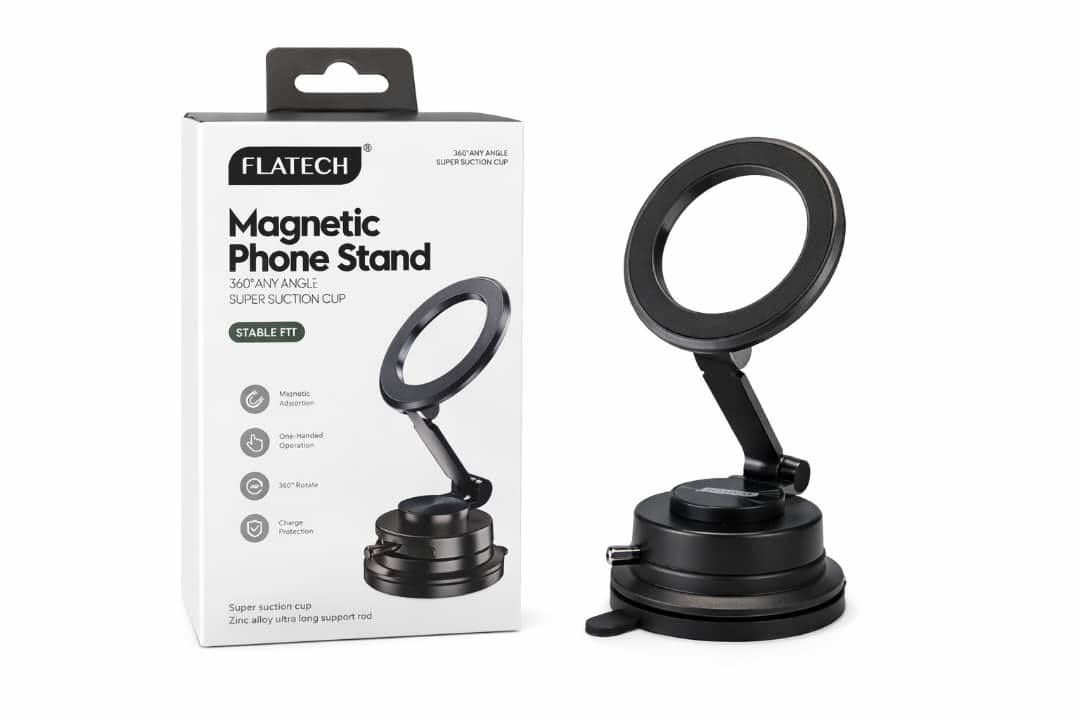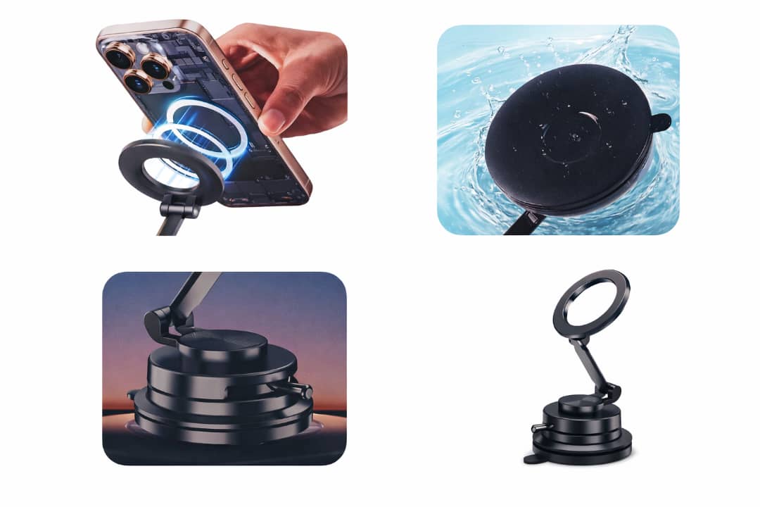 - جهة مغناطيسية لتثبيت الهاتف، وجهة شفط فراغي للاستخدام على الأسطح المختلفة.