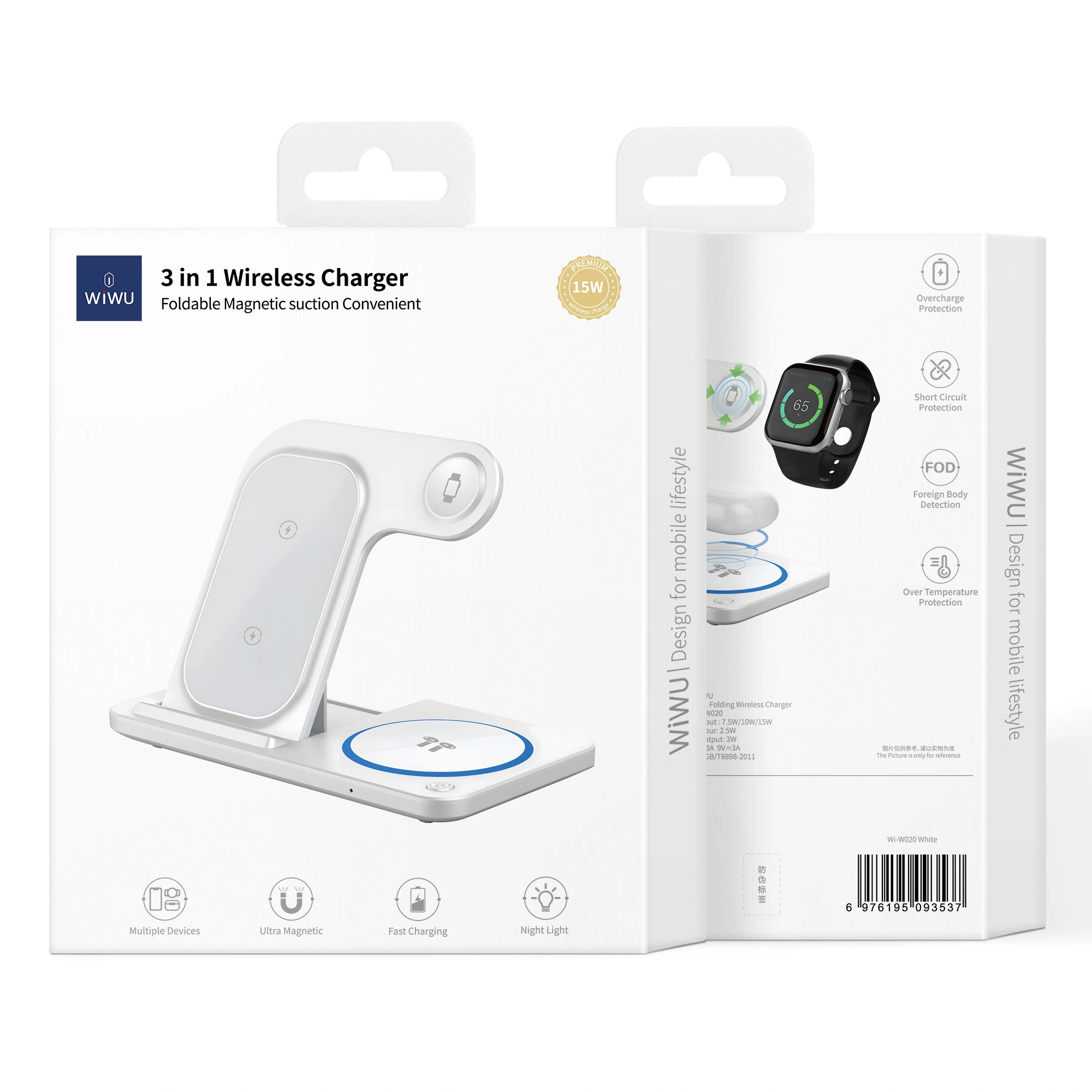 شاحن WiWU Wi-W020 اللاسلكي القابل للطي 3 في 1 هو محطة شحن متعددة الاستخدامات مصممة لشحن هاتفك الذكي وساعتك الذكية وسماعات الأذن في آنٍ واحد. تصميمه القابل للطي ومصباحه الليلي المدمج يجعله إضافة عملية وأنيقة لأي مكان.